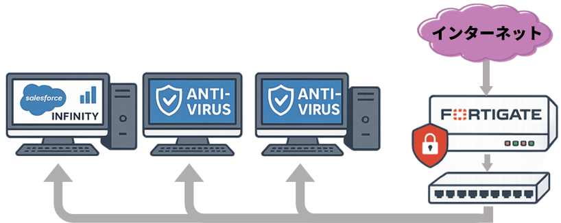 インターネットの入口には最新のUTM(FortiGate)を導入し、社内