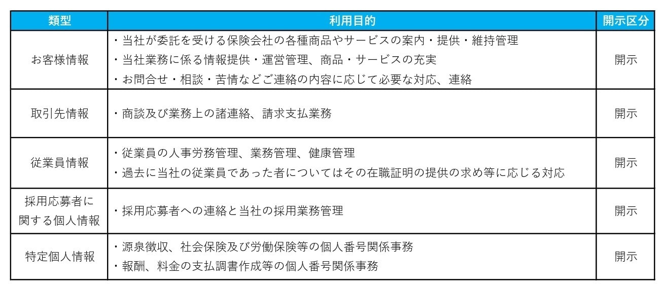 なお当社に対し、保険募集業務の委託を行う保険会社の利用目的は、各保険会社のホームページ(下記)に記載してあります。